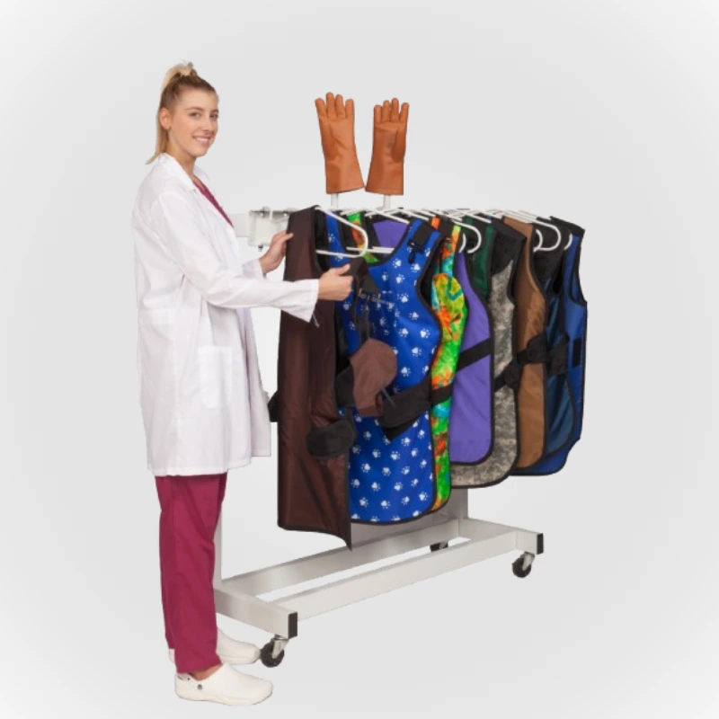 Keep your protective gear organized and in top condition with the Free Standing Deca-Rack. Designed to hold up to 10 pairs of aprons and skirts on pivot arms, it also accommodates gloves with the optional Glove-Rack Kit. A durable, space-efficient solution for busy imaging departments.